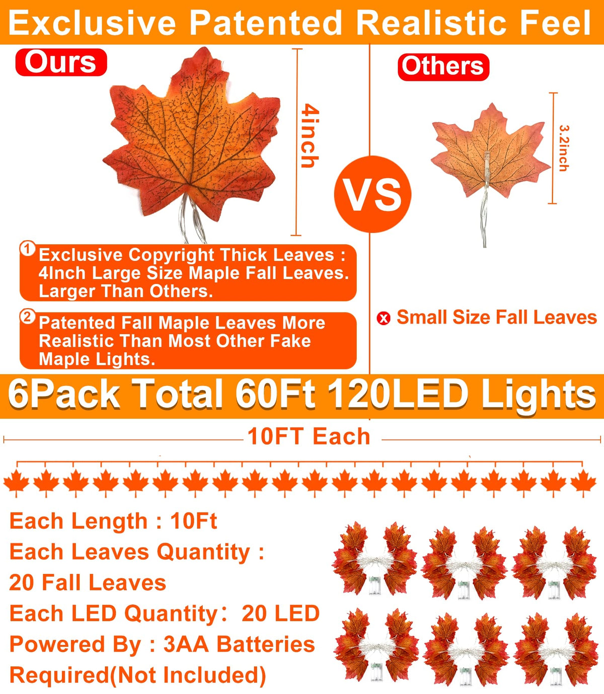 Design Patent Enlarged Maples Leafed Lights for Days and Nights Fall Halloween Decor: Design Patent Maples Leafed. 2 Pack Total 20ft/40 LED Lights with 40 fallen leafed decoration. The maples leafed are specially enlarged to 4 inch